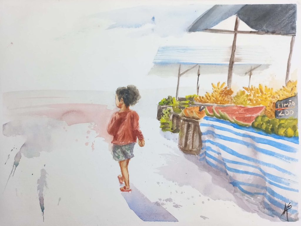 “Domingo na feira” é uma aquarela da série “Cores Cariocas” que celebra o encanto do cotidiano suburbano. A obra, marcada por uma paleta vibrante e gestos que se desfazem em borrões, traduz a efemeridade dos momentos e a magia do primeiro olhar. Ao fundir o figurativo e o abstrato, ela nos convida a redescobrir a beleza nas experiências simples, evocando e a intensidade de viver cada instante com renovado espanto.